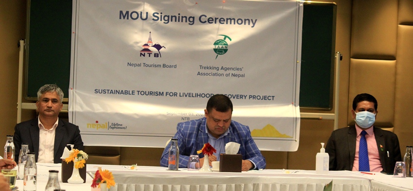 शुक्रबार काठमाडौंमा एक कार्यक्रमकाबीच नेपाल पर्यटन बोर्ड र ट्रेकिङ एजेन्सी एसोसिएशन अफ नेपाल (टान) बीच जीविकोपार्जनका लागि दिगो पर्यटन पुनःउत्थान गर्ने सम्झौता भएको हो ।