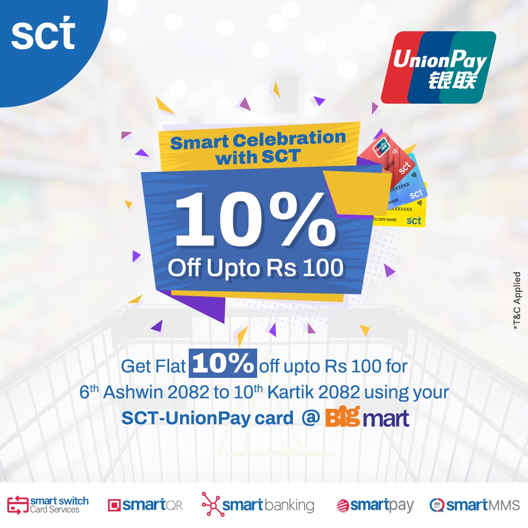यसको लागी भुक्तानी गर्न एससिटि युनियर पे कार्ड प्रयोग गरी पिओएस मेसिन मार्फतनै भुक्तानी गर्नु पर्नेछ । यो अफर घटस्थापना देखि छठ सम्म बिगमार्टको सम्पूर्ण शाखामा लागु हुनेछ ।