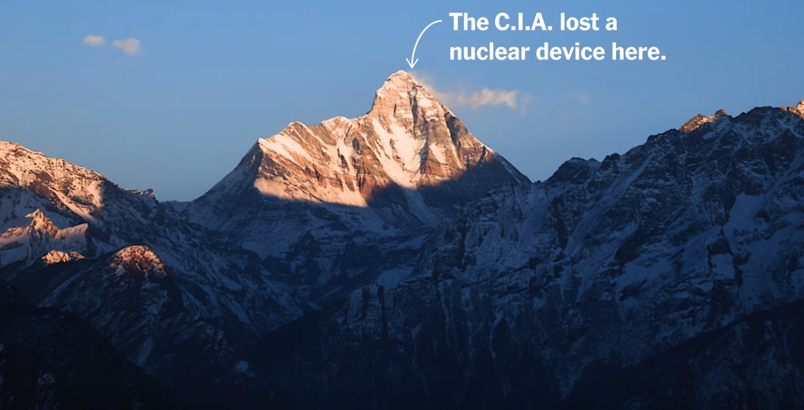 रिपोर्टका अनुसार भर्खरै आणविक बम परीक्षण गरेको चीनले गरेका बम तथा क्षेप्यास्त्र विस्फोटहरूको जानकारी लिन अमेरिका चाहन्थ्यो। त्यसका लागि हिमालमा उपकरण राख्ने योजना बन्यो र त्यसको जिम्मा सीआईएले १९६३ मा सगरमाथा चढेका नेसनल ज्योग्राफिकका फोटोग्राफर बिल बिसपलाई दियो। उनले जिम मकार्थीलगायत पर्वतारोहीको सहायता लिए।